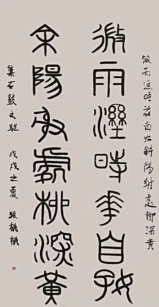 张桃桃 当代诗人 亦热爱书法,在《御生堂》任中药调剂师期间,有幸研习其古医方剂及书法之美,乐于学习探讨。之后偶遇习书人士大康先生传承人、《承堂》齐君老师并跟随学习,经口传心授石鼓文临摹而习得作品,同期参加国开书法学院“书苑点晴”、“新书苑”两期全国榜书艺术暨师资技能书法高研班学习,作品入选期刊。