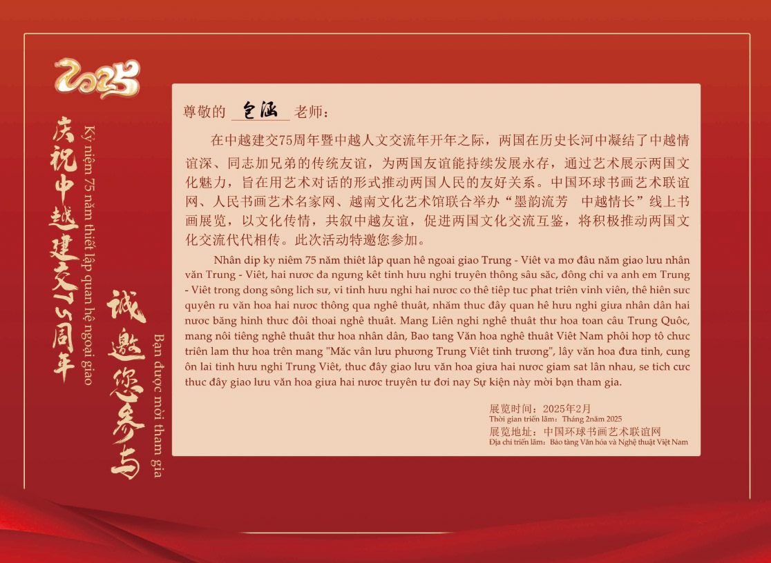 今年是中越两国建交75周年暨中越人文交流年开年之际,两国在历史长河中凝结了中越情谊深,同志加兄弟的传统友谊,为两国友谊能持续发展永存,通过艺术展示两国文化魅力,旨在用艺术对话的形式推动两国人民的友好关系。中国环球书画艺术联谊网、人民书画艺术名家网、越南文化艺术馆联合举办“墨韵流芳 中越情长”线上书画展览,以文化传情,共叙中越友谊,促进两国文化交流互鉴,将积极推动两国文化交流代代相传。